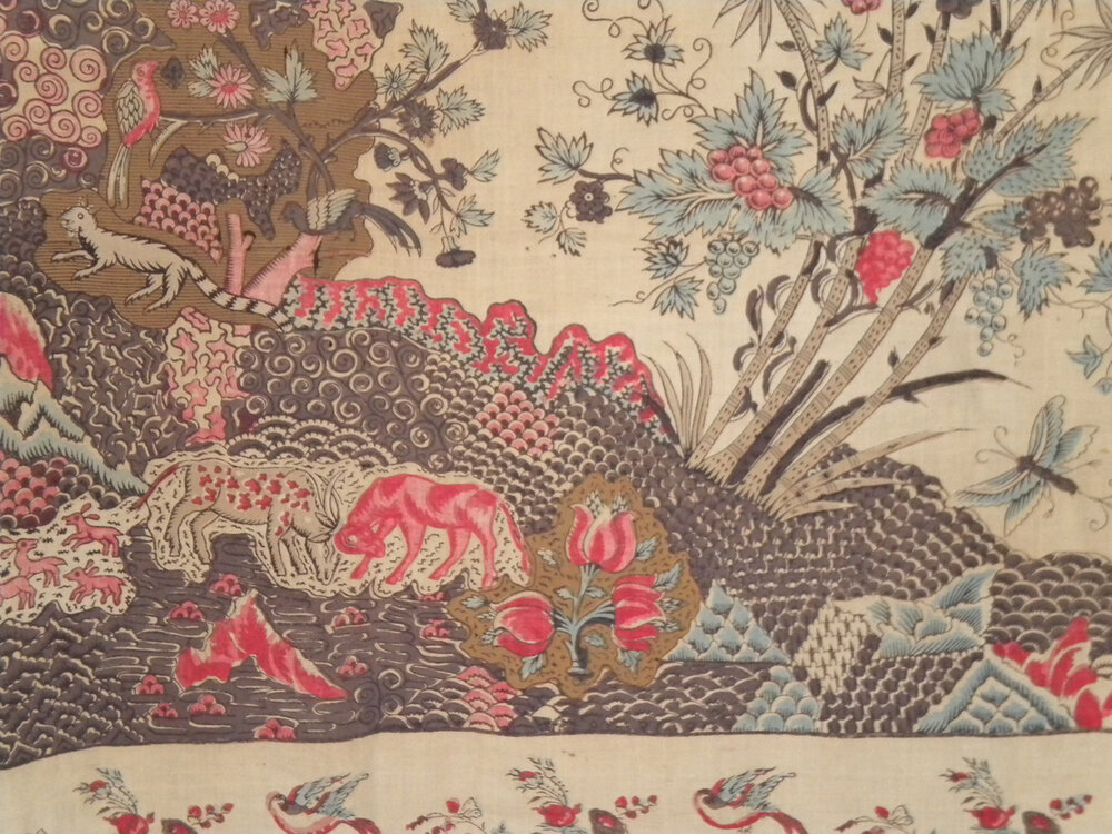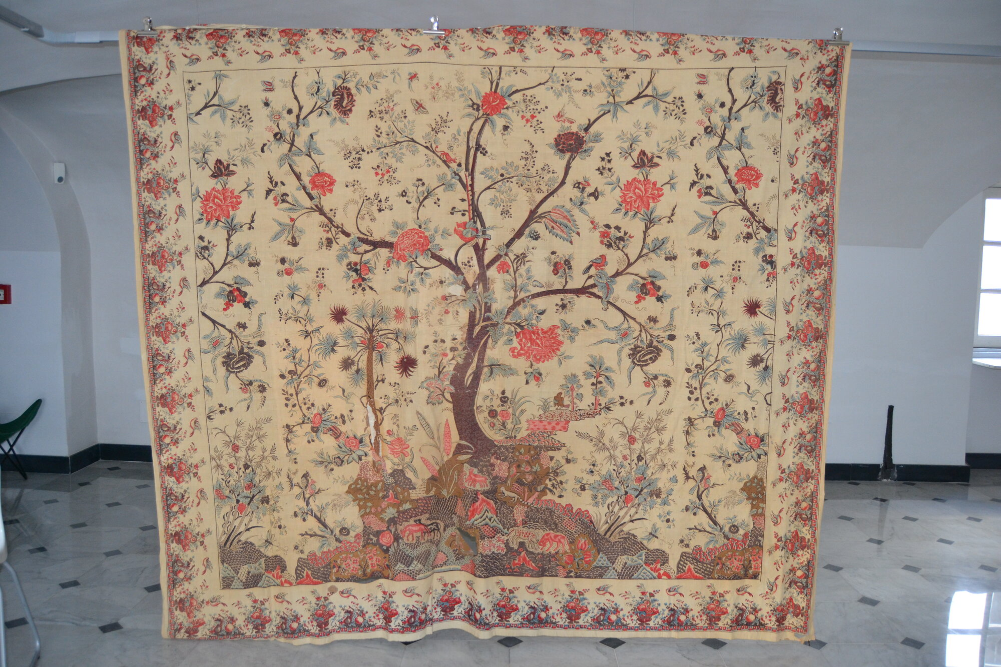 lato dell’esemplare. Il mezzero è in tela di cotone stampata con matrici lignee, caratterizzato dal motivo dell'albero vecchio e decorato con varie tipologie di animali.